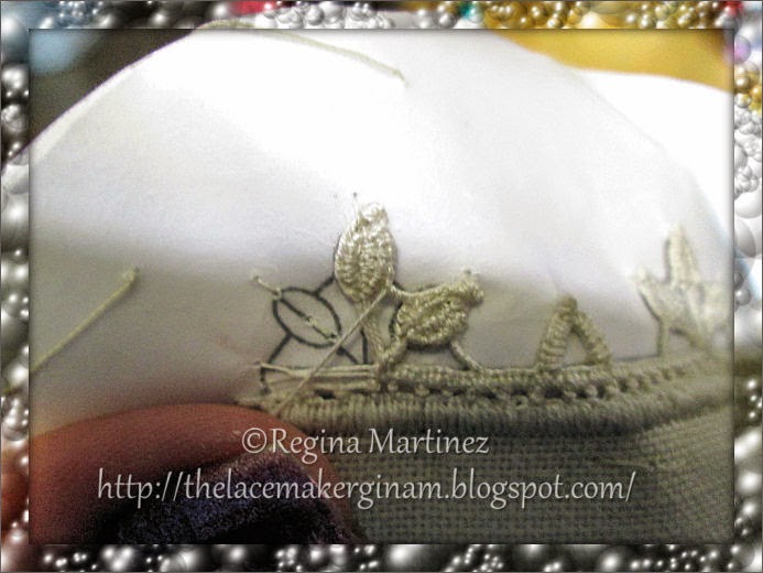 So the second side began with a row of Punto Chiaro stitches. . . these are small stitches that add a tiny bit of height to the row, and I place them every third stitch. Then I layed 2 threads for what I refer to as the "traveling buttonhole stitches" because they are what gets me to next trio of leaves (or bread loaves as I have seen them called before) and arch.